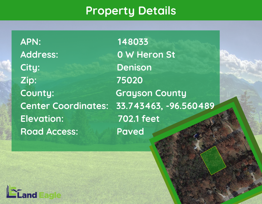 If you’re looking for a place to build your perfect home that bathes in that soothing small-town vibe with great arts and music, then this 0.44-acre gem in Denison, TX is perfect for you! Located in W Heron St, this lot comes with a generous space that’s not only within the city limits but a quiet and friendly neighborhood, as well! With downtown just a couple of miles away, you’ll enjoy less hassle in restocking for your daily supplies!