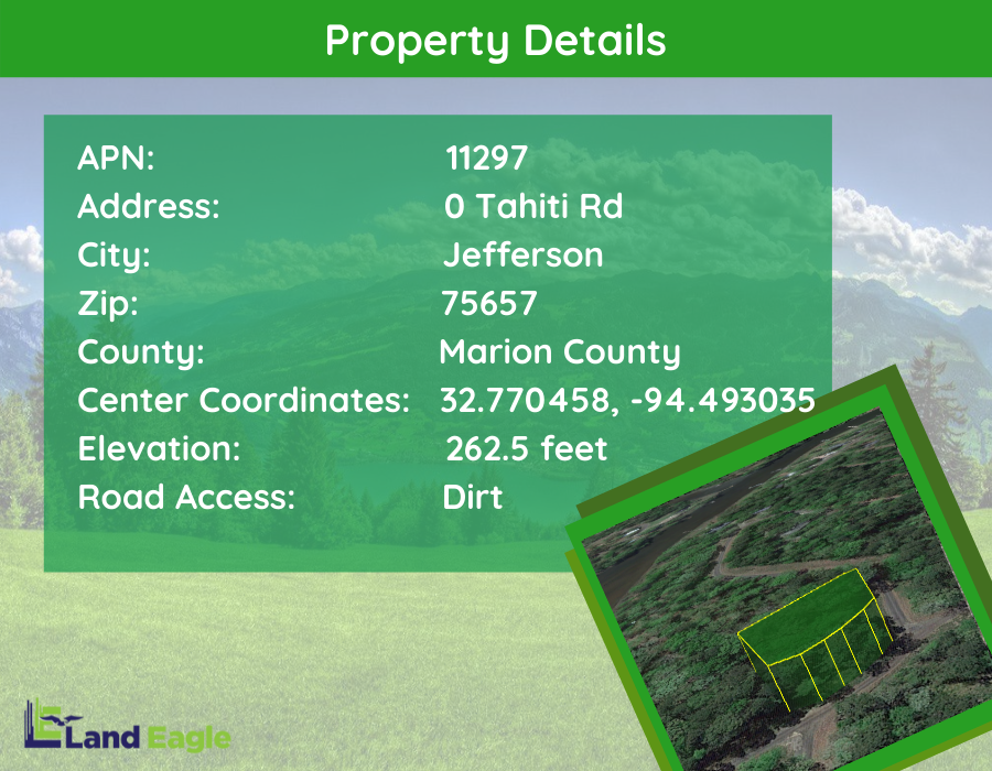 Own this stunning 0.30-acre lot near Lake O’the Pines in Northern Texas! Take advantage of this offer now because this is definitely priced to sell fast only for you. Easily accessed via Tahiti Rd and only about 10.4 miles West of downtown Jefferson, TX. Did we mention the skies? Yes, this property is so deep in nature that you can stare up at star-filled skies, feeling calmness and a sense of inner harmony. Downtown is beautiful with flower and tree lined streets and many historic buildings restored to their original state. Jefferson has restaurants, many unique shops, and other interesting establishments all within walking distance in the heart of town. Recreational activities are unlimited from local trout streams to mountain biking. Like what you’re reading? Then call us now to learn more about this gorgeous offer.